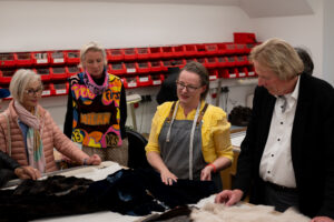 Ein besonderer Programmpunkt waren die Behind-the-Scenes-Touren durch unser Haus und Atelier. Unsere erfahrenen Kürschner führten die Besucher durch den Entstehungsprozess eines Pelz- oder Lammfellmantels. Vom sorgfältigen Auswählen der Felle über das Zuschneiden bis hin zur aufwendigen Verarbeitung konnten unsere Gäste hautnah erleben, wie viel Handwerkskunst in jedem einzelnen Stück steckt. Bei Live-Demonstrationen wurde gezeigt, wie etwa eine Fellkante vorbereitet oder wie einzelne Pelzteile präzise zusammengesetzt werden.
